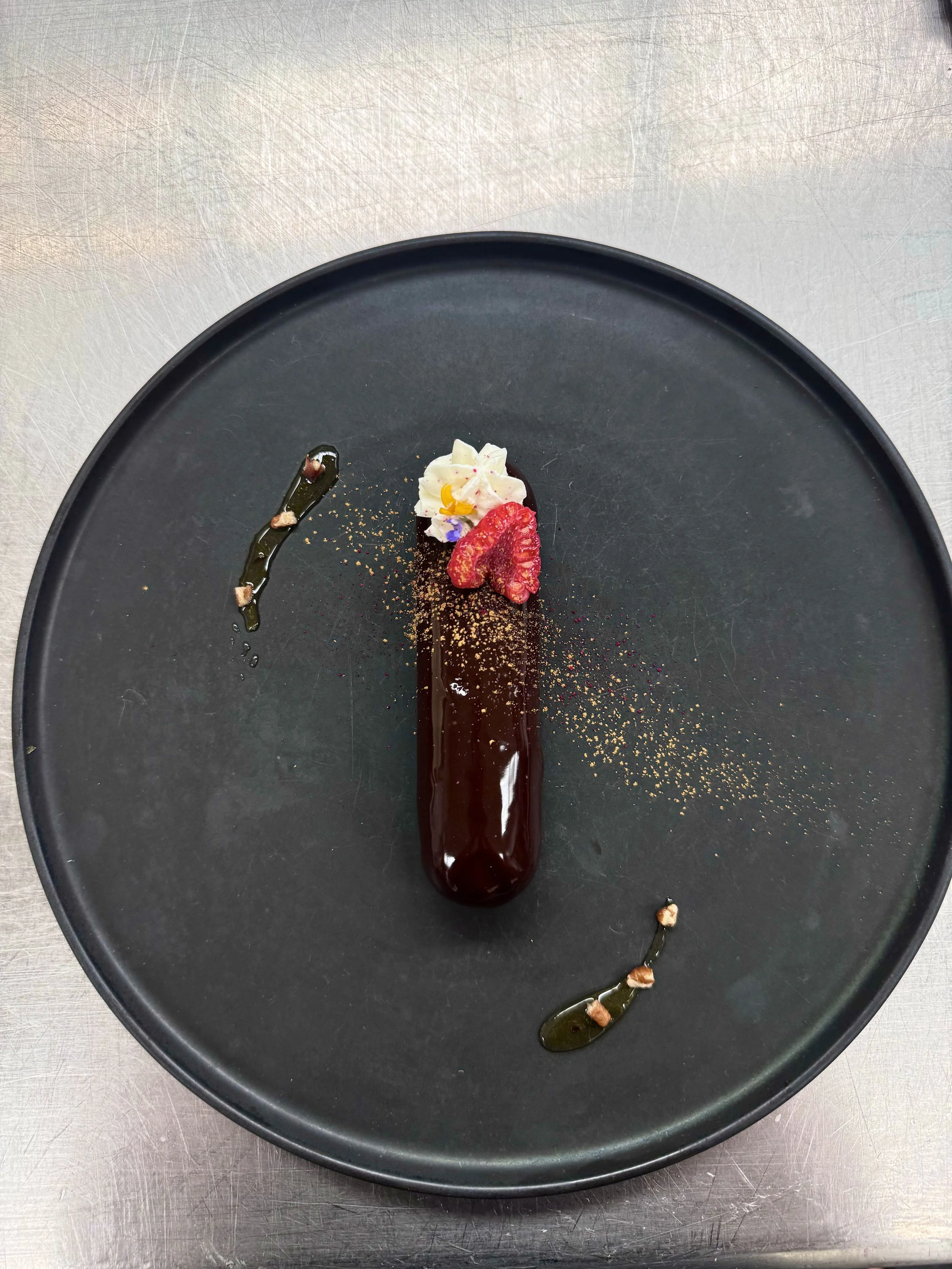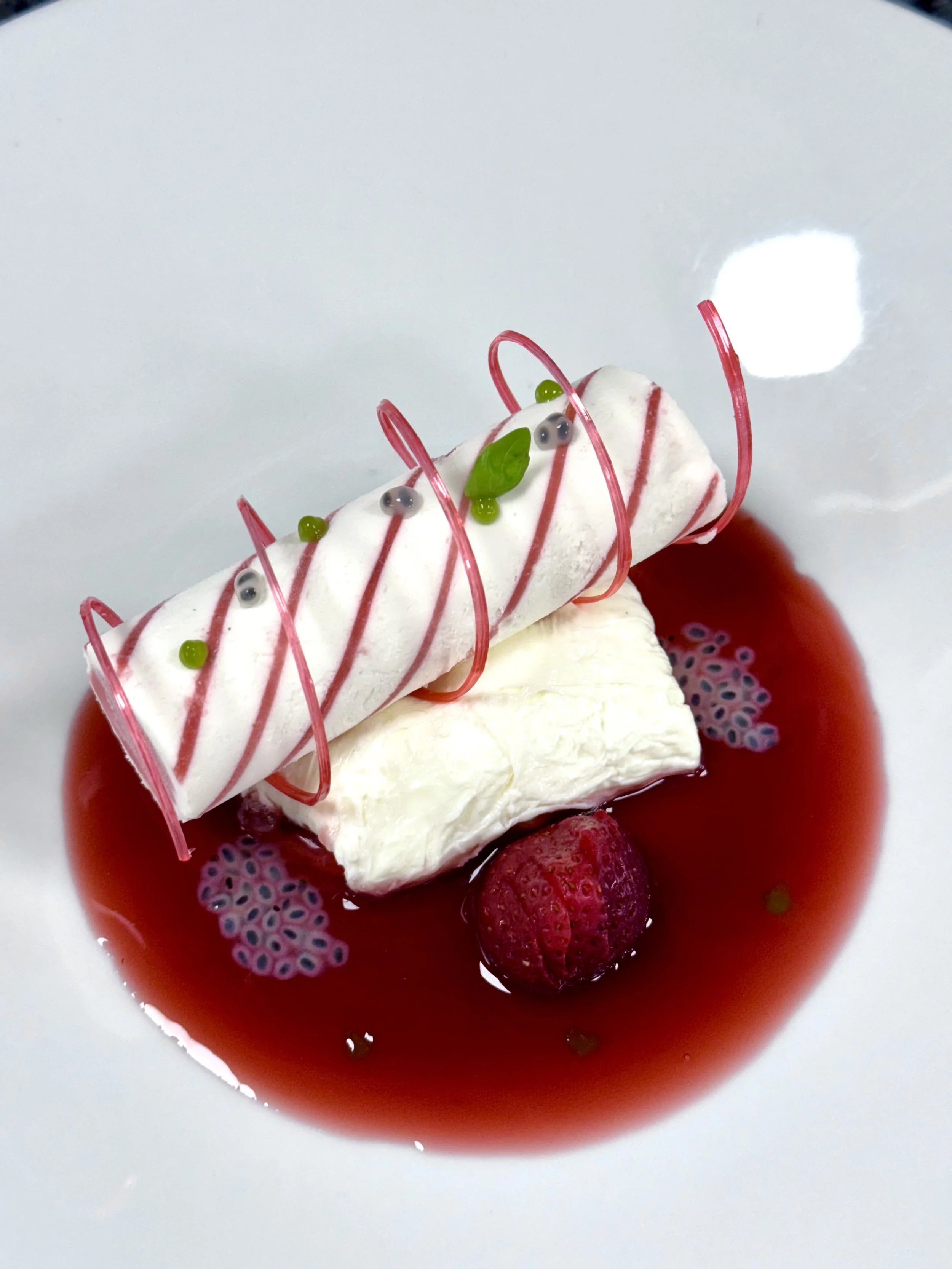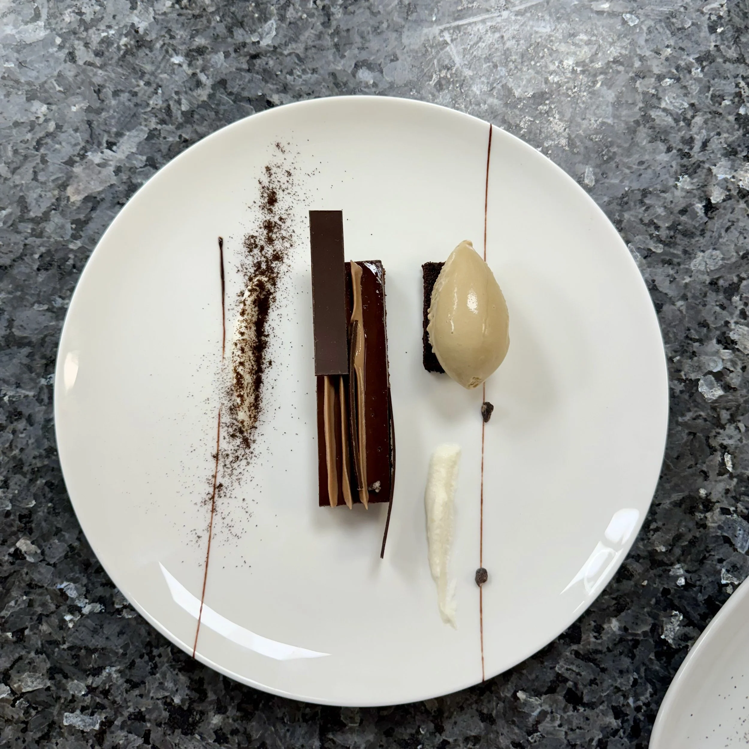 opera cake with passionfruit seeds, vanilla marshmallow and coffee infused white chocolate ganache
